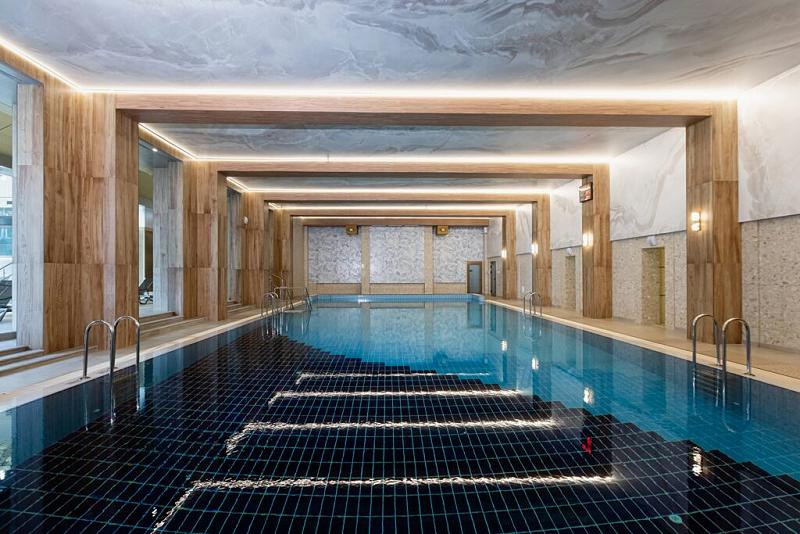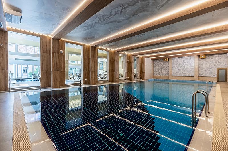 Крытый бассейн с подогреваемой морской водой длиной 25 метров с подводным гидромассажем находится в СПА-центре медицинского корпуса.