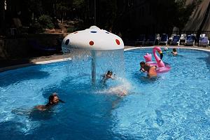 Детский открытый бассейн с подогреваемой морской водой, размером 7х14 метров, площадь зеркала 76 кв.м. Работает в период с мая по октябрь.