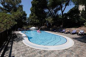 Под кронами вековых сосен расположены открытый бассейн с подогреваемой водой для взрослых, 11х26 метров, площадь зеркала 225 кв.м., глубина от 0.7 до 2 метров.