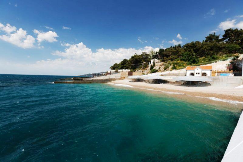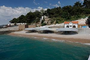 Пляж с мелкой галькой, оборудован всем, что необходимо для комфортного отдыха: комфортные шезлонги, бунгало, теневые зоны, лежаки, душевые, раздевалка, лодочная станция, набережная, панорамный лифт, а также лифт в скале с историей и галереей в туннеле.